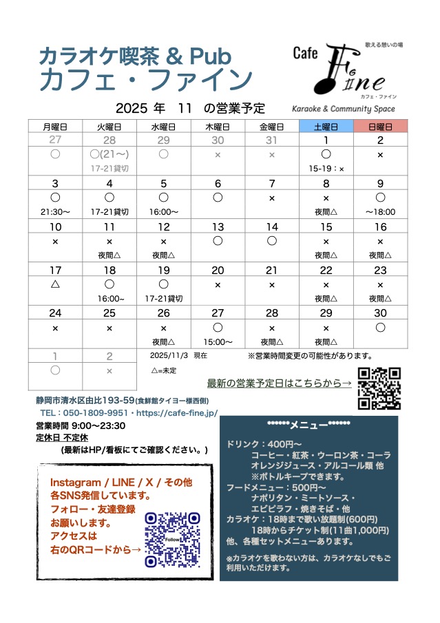 今月より、店舗で配っている営業日カレンダーを掲載することにしました。